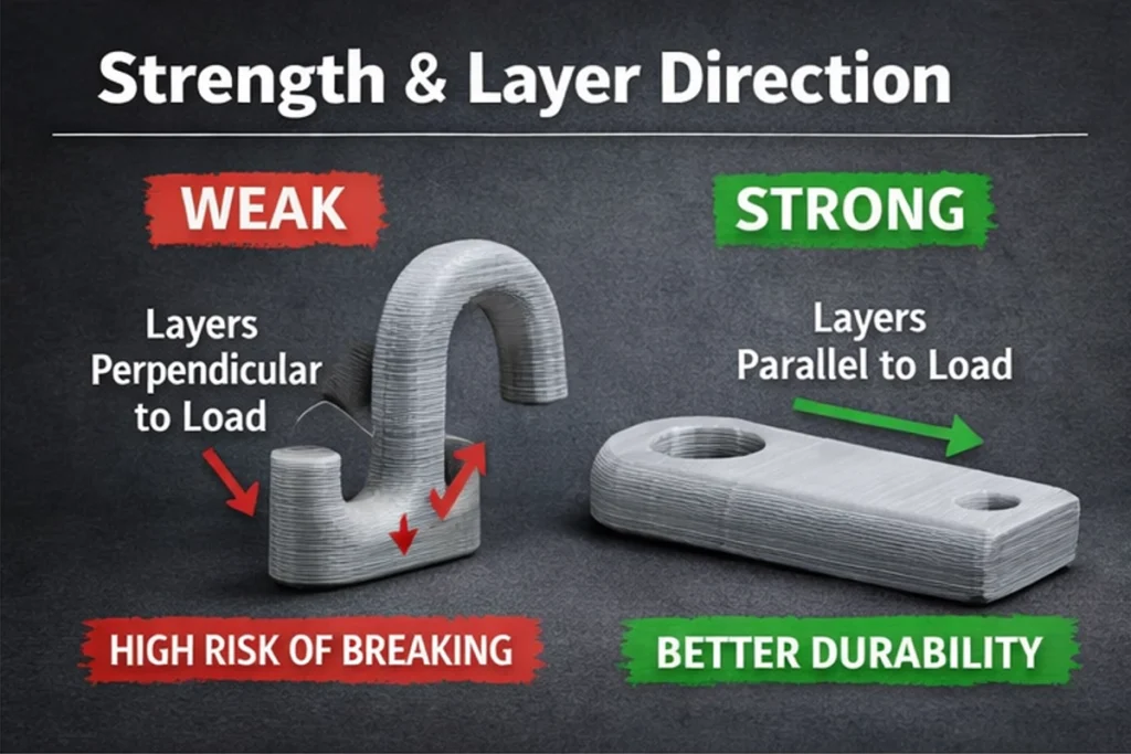 This matters because most 3D printersโespecially FDM printersโbuild objects layer by layer. Each layer is bonded to the one below it, and that bond is not as strong as the material itself.