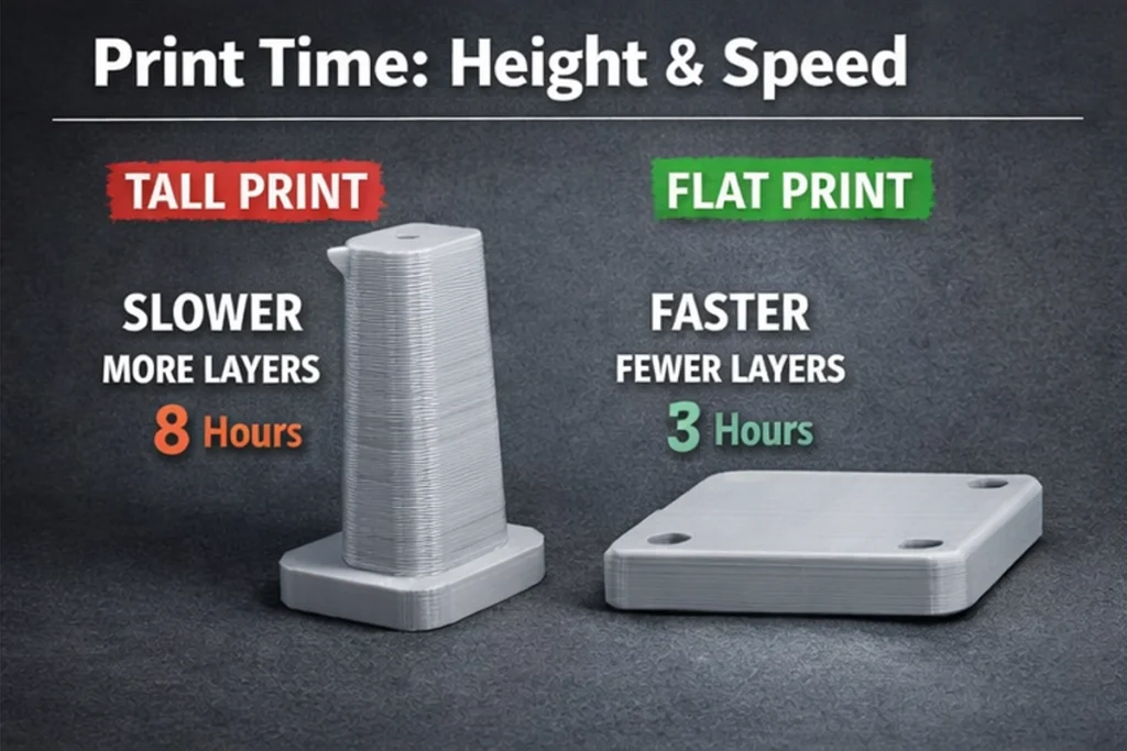 Yes, significantly. Taller prints require more layers, which increases print time. A flatter orientation can speed things up, but may require more support.