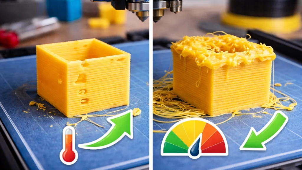 If the temperature is too high, reduce it by 5โ10ยฐC while staying within the filament manufacturer’s recommended range.