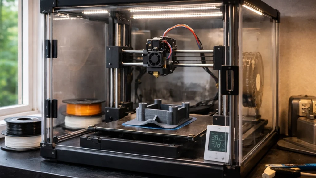 An enclosure maintains a stable ambient temperature and shields prints from drafts.